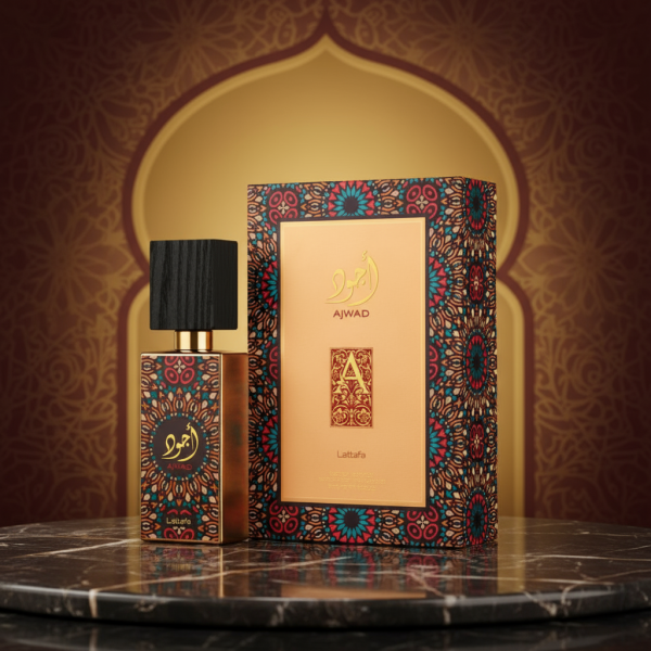 Ajwad Lattafa is the finest natural fragrance with a sweet scent rich in amber, rose, and sandalwood. It features a slightly caramelized vanilla scent with hints of fruit and cedarwood. You’ll feel as if you’re immersed in a world full of tales and dreams, making this fragrance the perfect choice for relaxing and magical times. It comes in an elegant bottle and a beautiful outer box.